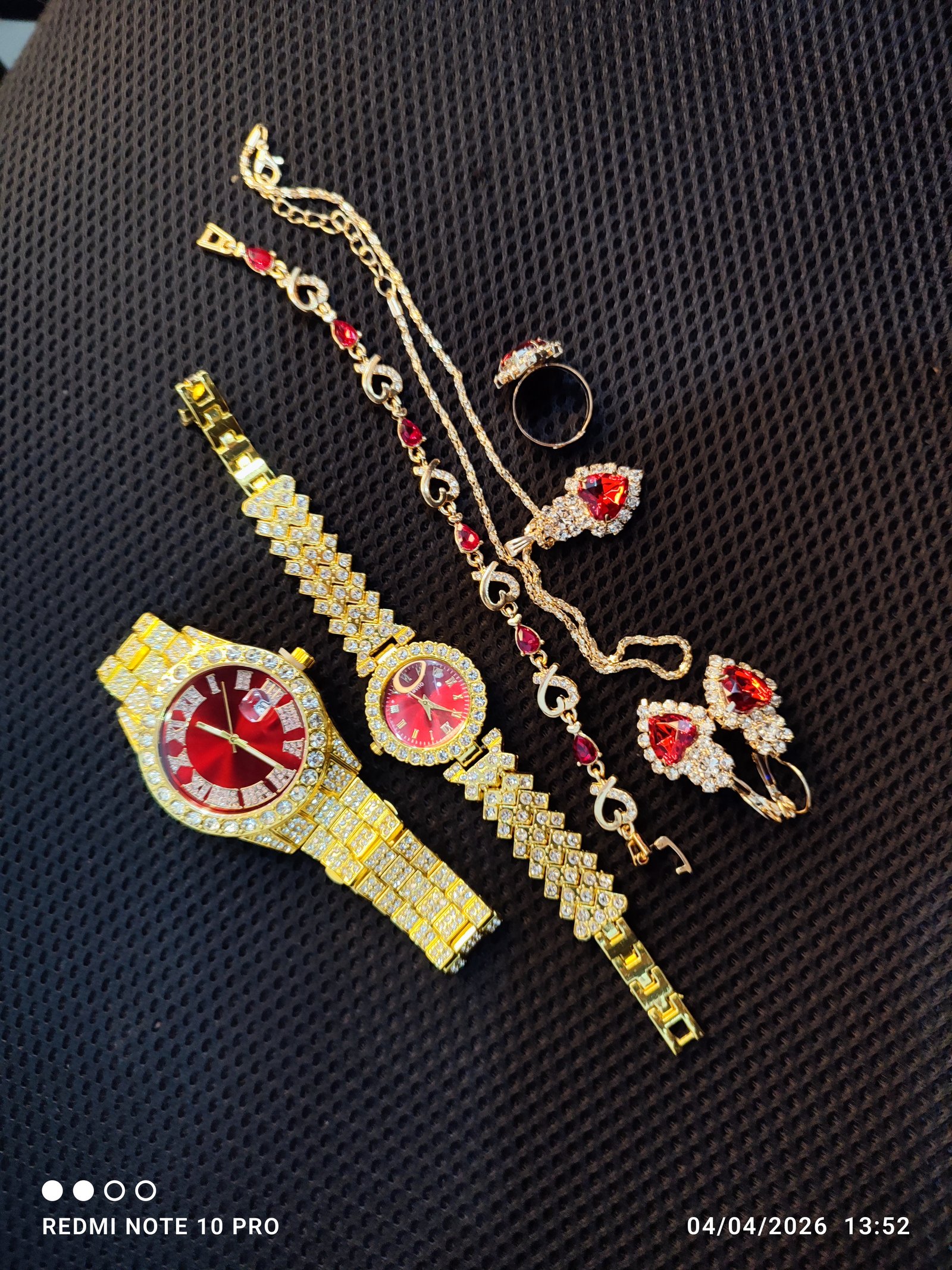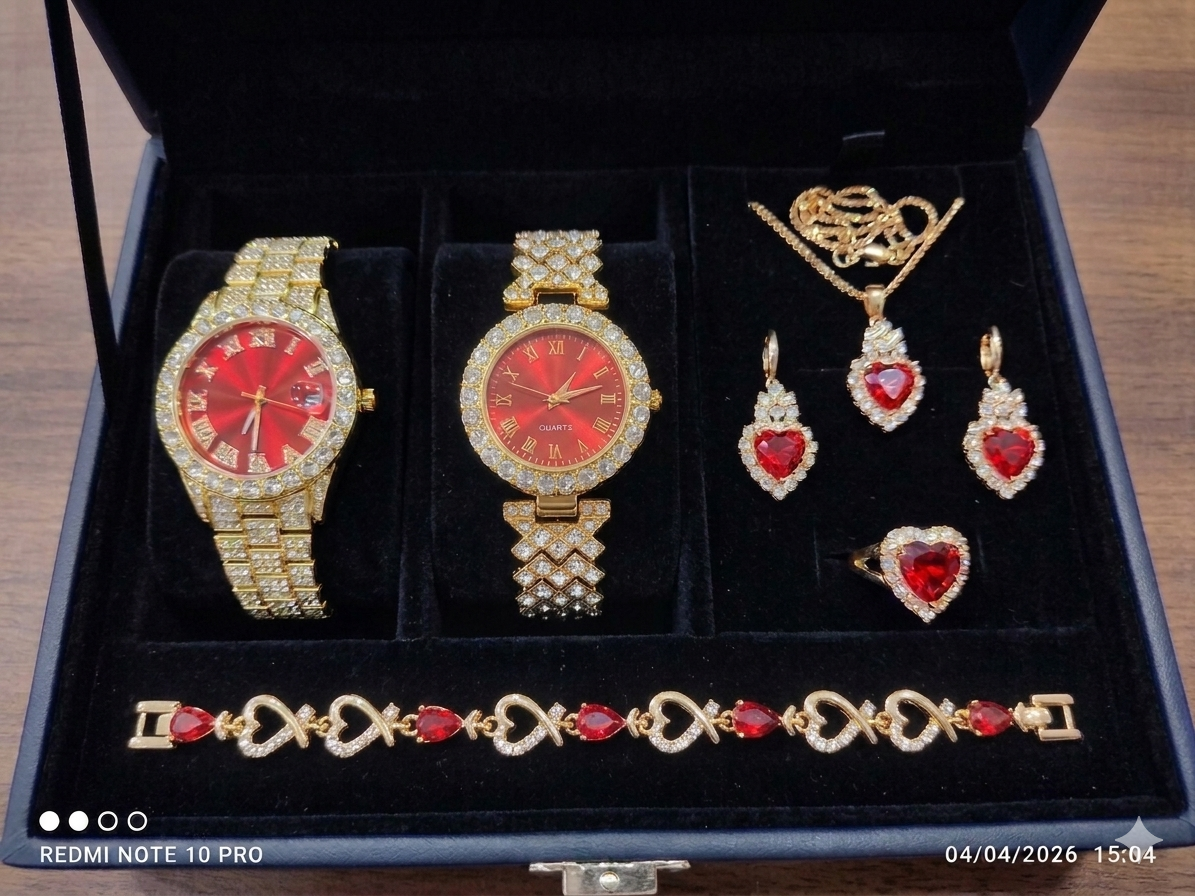 - এক্সক্লুসিভ জুয়েলারি সেট: হার্ট শেপ লাল পাথরের চমৎকার একটি নেকলেস, এক জোড়া ম্যাচিং কানের দুল এবং একটি প্রিমিয়াম আংটি।